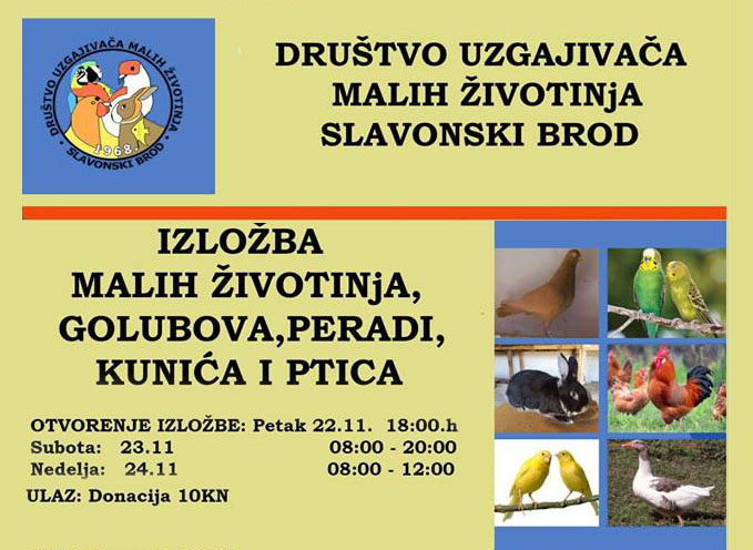 SLAVONSKI BROD – Društvo uzgajivača malih životinja Slavonski Brod organizira 43. Međugradsku i 19. Županijsku izložbu malih životinja, golubova, peradi, kunića i ptica. Izložbu održavaju od 22 do 24. studenoga 2019. u Podvinju u prostoru Mjesnog doma. Društvo poziva sve zainteresirane uzgajivače koji žele izlagati svoje životinje na izložbi u Podvinju da se prijave, dolaskom u prostorije društva u ulici Josipa Jurja Strossmayera br. 15 u Slavonskom Brodu svakog petaka od 19,00 satih ili mailom na adresu dumzsb@gmail.com. Prijem izložbenih primjeraka je u četvrtak 21. studenoga od 12,00 do 20,00 sati. Posjetitelji će osim na otvorenju izložbe životinje moći pogledati u subotu 23. studenoga od 8,00 do 20,00 sati, i nedjelju 24. studenoga od 8,00 do 12,00 sati. U znak podrške organizatorima posjetitelji na ulazu u izložbenu salu mogu uplatiti prigodnu donaciju u iznosu od 10 kuna.